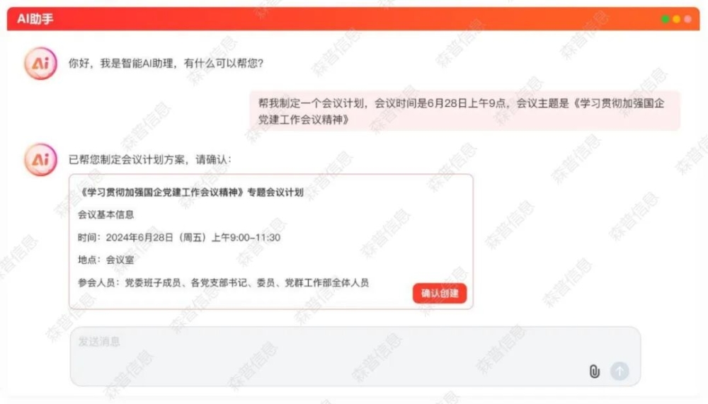 传统党课准备工作中,组织者需要手动筛选课程、安排议程、协调时间,耗费大量精力却难以保证计划的科学性和针对性。基于深度求索的大语言模型技术,森普AI党课能够快速生成专业会议计划,保障方案科学性与实用性。会议前智能推送提醒,确保参会人员准时参与,提升会议组织效率与质量。