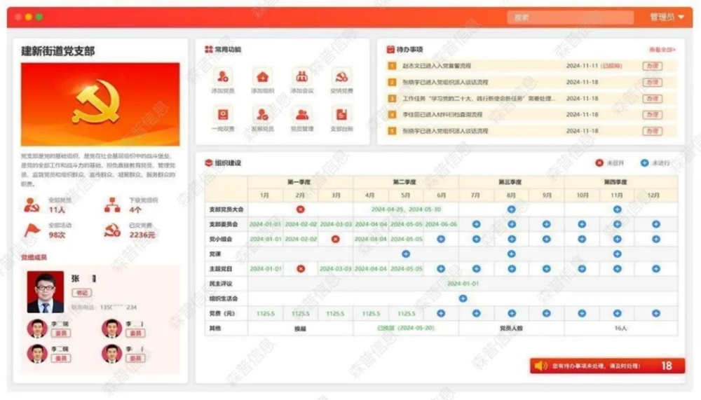 森普创新推出的AI党课系统深度融合AI能力,实现党课从计划到分析复盘的动态跟踪与智能管理,覆盖计划制定、自动提醒、会议召开、智能签到、会议总结、会议心得、会议分析、对比分析全流程 。创新应用“有规划、有执行、有总结、有分析”的“AI四有管理模式”,为党建工作注入智能新动能。