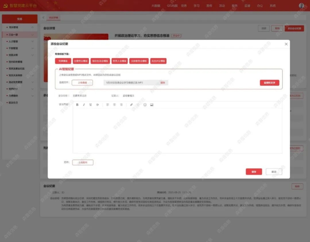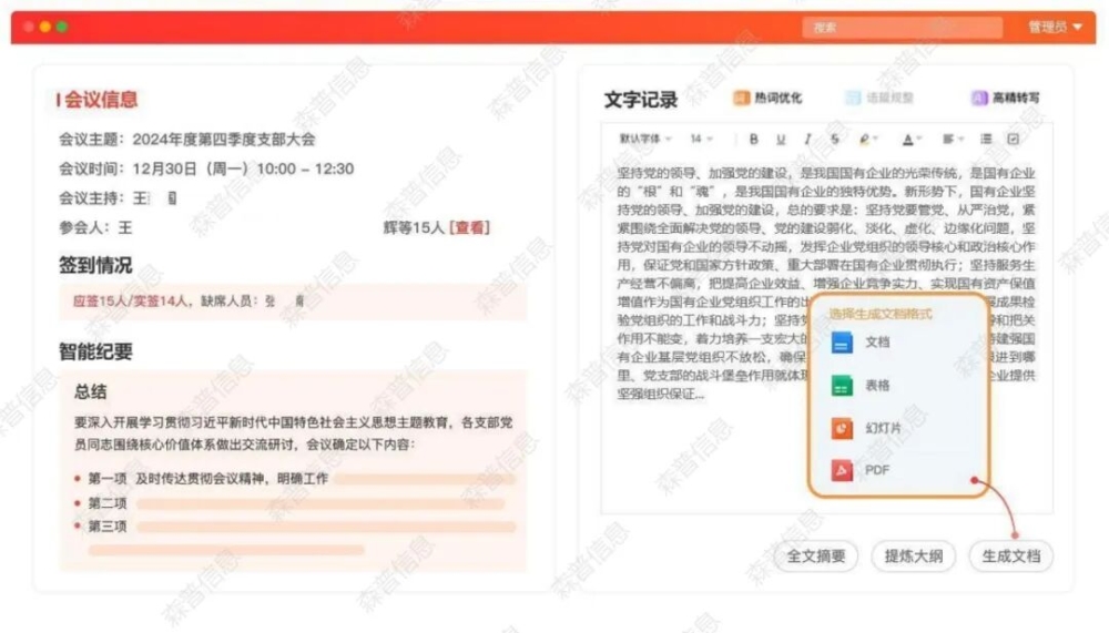 森普AI党课的总结功能,基于先进的大语言模型技术,将会议声浪转化为结构化知识,只需三步,即可完成过去数小时的人工工作。
