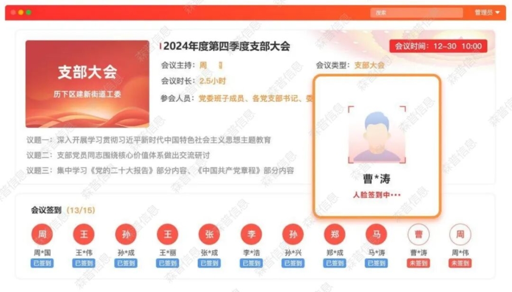 为解决会议执行过程中依赖人工操作、签到效率低、数据统计滞后的痛点,森普AI党课自动开启会议管理功能,支持人脸识别和手机扫码双模式签到,并实时生成参会数据看板和签到数据报表,清晰呈现签到人数、签到方式分布、签到时间节点等信息,便于会后复盘与决策。