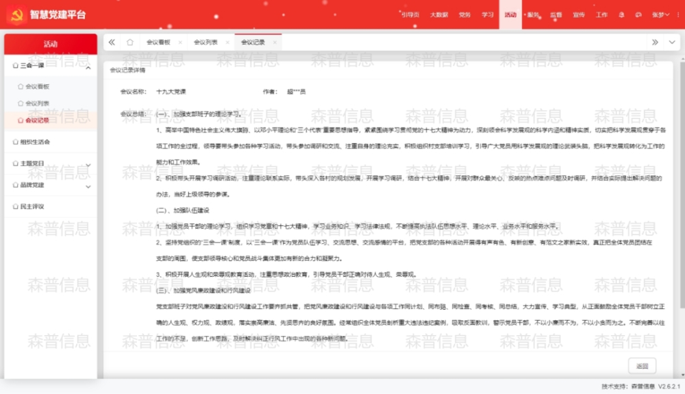 森普三会一课全过程纪实痕迹化管理,为“三会一课”带来了全新的管理模式和高效运作流程,对“三会一课”制度的执行效能带来了显著的积极影响和贡献,进一步促进了党内政治生活的制度化和标准化。