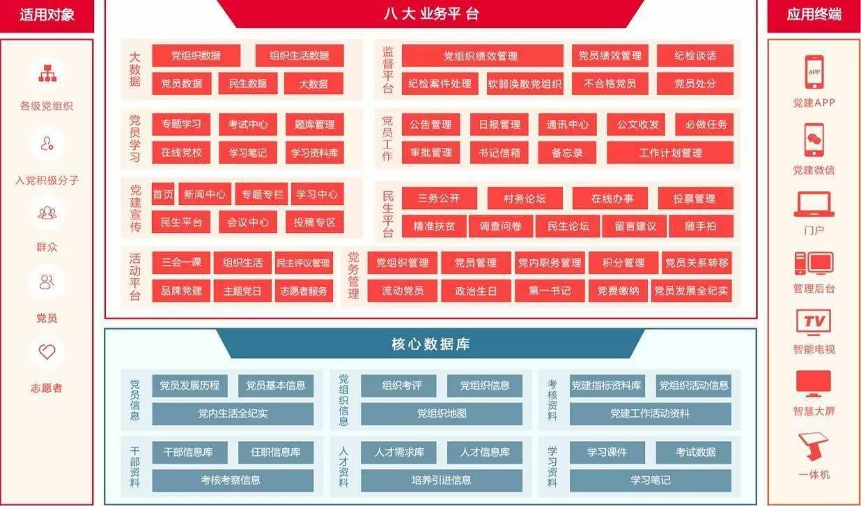 此次搭建的“智慧党建云平台”针对的是现阶段党员和党组织内部存在的一些建设问题,提出相应的措施,主要包括三大应用终端,即党建门户、手机APP、PC管理后台三大终端,内容涉及党建宣传、党员学习、民生管理、党务管理等功能模块,实现以用户为中心,解决用户日常实际工作问题,帮助用户提高工作效率,从而调动党员参与积极性。