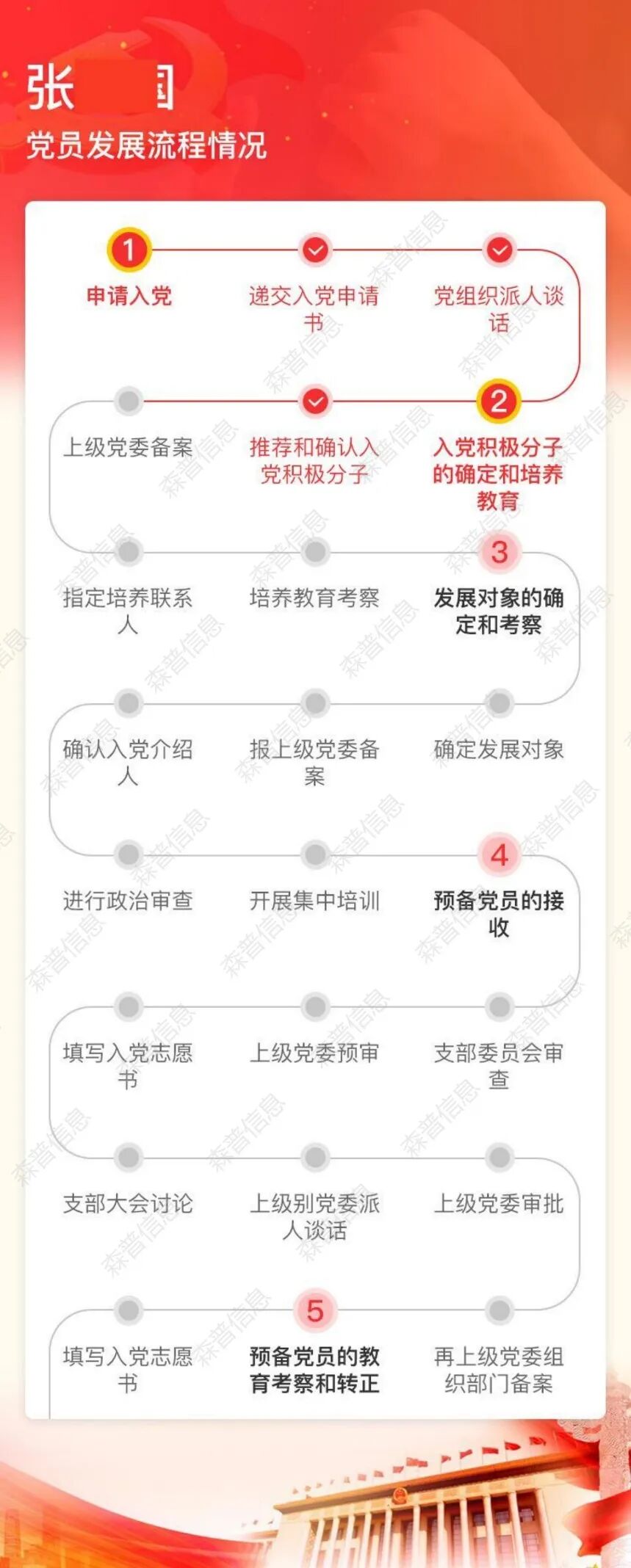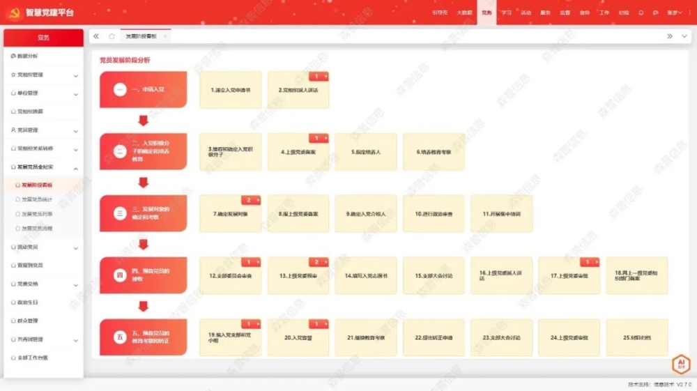 党员发展过程环节多、要求严,从递交入党申请到最终转为正式党员,包含申请、培养、考察、审批等关键节点。智慧党建系统将这一复杂过程提炼为清晰可视的“25步”标准化流程,并形成直观的节点时间轴流程图。系统会依据预设逻辑,自动提示当前阶段应完成的任务、下一步工作安排以及各环节的时间要求。例如,当一位同志被确定为入党积极分子后,系统会自动提醒党支部开始指定培养联系人,并进入下一阶段的培养考察期。这种“一步一提醒”的机制,有效避免了因事务繁忙或人员交接导致的流程中断、时限延误等问题,确保了发展党员工作的规范性和连续性。
